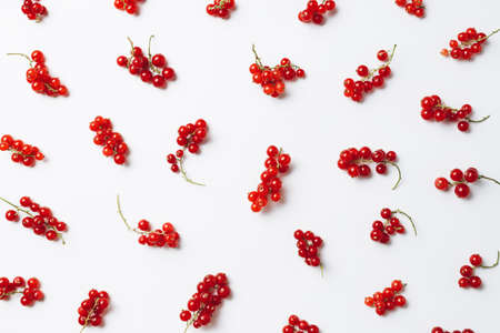 Pattern of red currants isolated on a bright white background. Red currant clusters, healthy diet. Creative fruit food concept. Flat lay, top view.