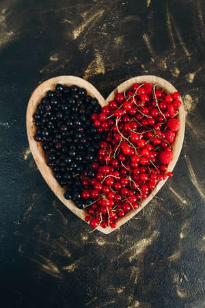 Fresh ripe currant red and black berries bowl on wooden table background