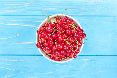 White bowl filled with fresh red currants on a blue wooden background, top view
