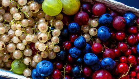 Abstract Close up colorful berries such as blueberry, cherry white currant & red currant
