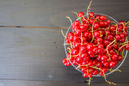 Red currants in a bowl on a wooden table, top view.