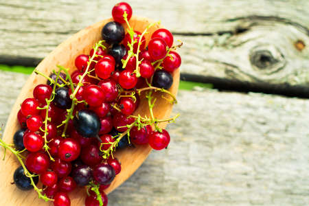 black and red currants gooseberries on wooden background