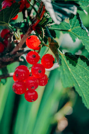 red sweet currant berry with green leaves, summer harvest