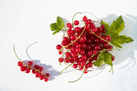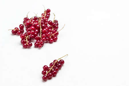 Sprigs of red currants on white. Berry background. Top view. Copy space