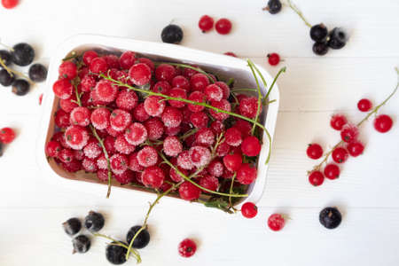 Frozen red and black currants in on a light background . The concept of preparing products for use in the future.