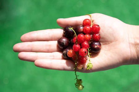 Hand holding fresh berries, ripe red currant and black currant, juicy fruit.