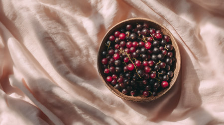 Delight in this vibrant assortment of fresh berries elegantly arranged in a wooden bowl against a soft fabric backdrop, perfect for health or culinary themes.
