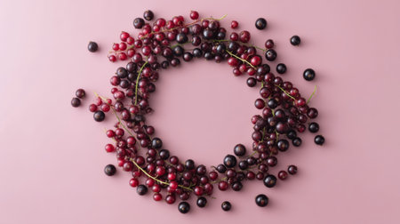 A stunning arrangement of fresh black currants on a soft pink background, perfect for emphasizing healthy eating, vibrant colors, and culinary creativity.