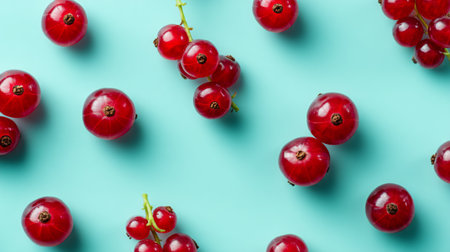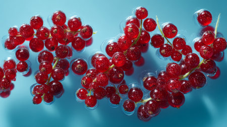 This stunning image features vibrant red currants presented against a soft aqua background, showcasing their juicy, glossy texture and appealing bubbles, perfect for food art.
