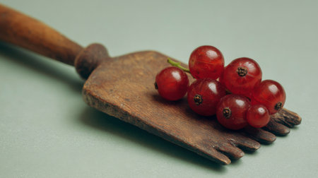 A wooden fork rests on a smooth surface with a cluster of red currants placed atop, highlighting a rustic gardening theme and fresh organic produce.
