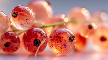Close-up view of fresh red currants adorned with glistening water droplets, highlighting their juicy texture and vibrant colors ideal for culinary and healthy food imagery.