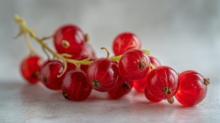 A beautiful cluster of fresh red currants resting on a light surface, perfect for illustrating healthy eating, vibrant flavors, and natural ingredients in culinary designs.