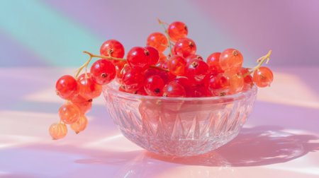 A stunning arrangement of fresh red currants in a clear glass bowl, set against a soft pink background that enhances the vibrant colors and natural appeal.