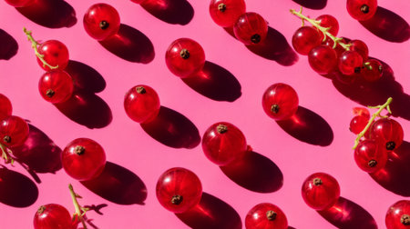 A stunning arrangement of bright red berries on a lively pink background, creating a playful contrast. The shadows add depth, making this perfect for fresh food visuals.