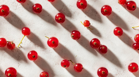 Vibrant red berries scattered on a light surface, casting dynamic shadows. This visual captures freshness and invites uses in food photography or culinary themes.