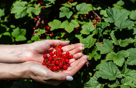 Woman holding red currant berries in her hands. Harvest in the garden. (Ribes rubrum)