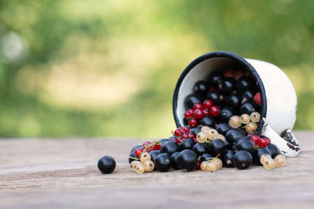Image of inverted white old iron mug with scattering of black white and red currant berries spilled out of it on light wooden table on green natural background. Ecological food. Natural vitamins.