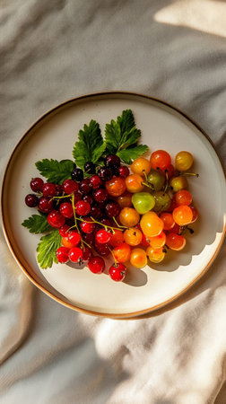 An array of vibrant fruits including cherries, currants, and gooseberries is artistically displayed on a white plate, illuminated by warm sunlight.