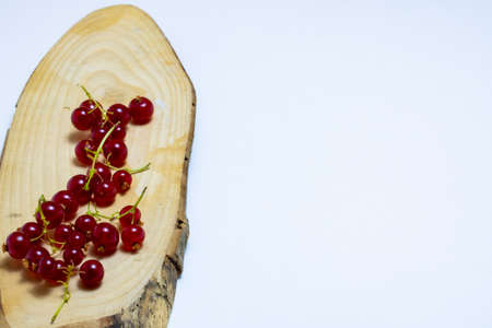 Red currants on the piece of wood on white background