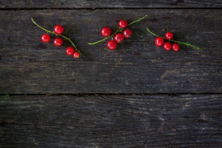 juicy fresh red currants on a dark old wooden background, top view.