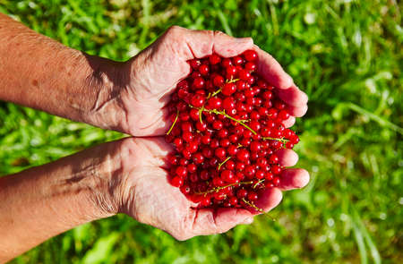 Ripe berries of red currant in female palms. Against the background of green grass.