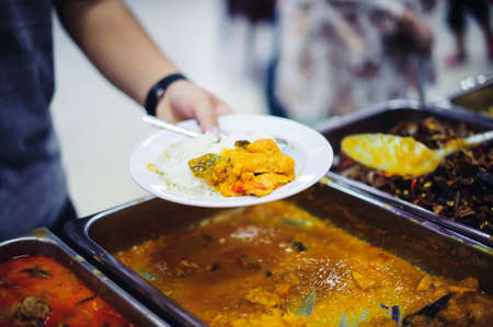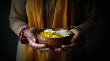 Indian woman hands holding a bowl of rice with curry, selective focus