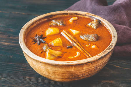 Close up of woman hands holding hot and spicy curry with beef in bowl.