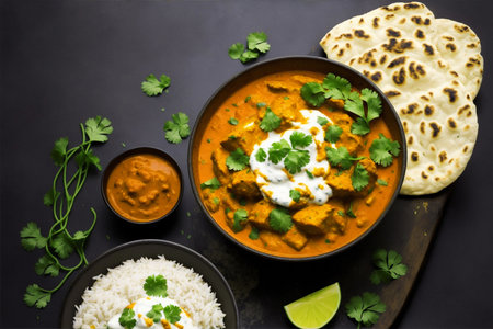 Close up of butter chicken curry garnished with cilantro and rice, served alongside naan bread, creating a vibrant and appetizing Indian cuisine scene