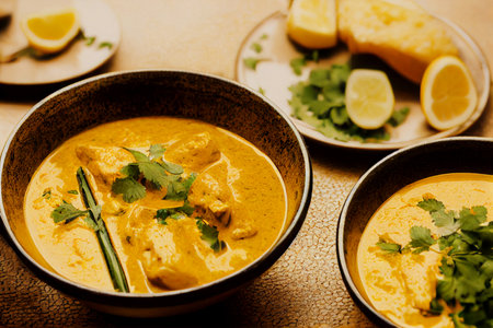 A bowl of fragrant curry garnished with fresh herbs, accompanied by crispy snacks and rice. Perfect for a cozy meal setting, showcasing vibrant flavors.