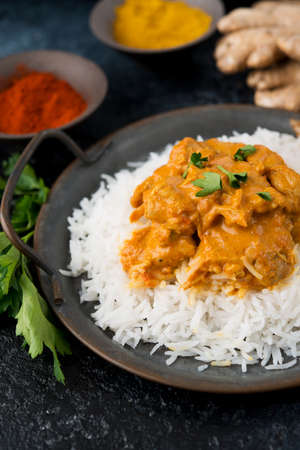 Chicken curry with rice and spices - a traditional popular Indian dish, selective focus
