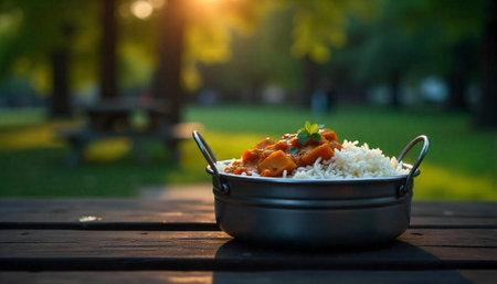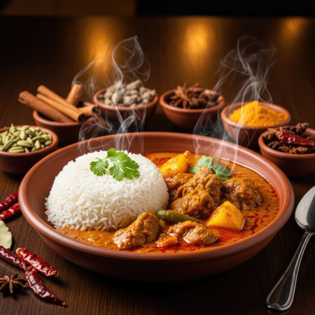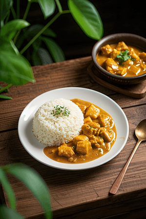 Colorful vegetable curry served with aromatic rice and fresh herbs on a wooden table