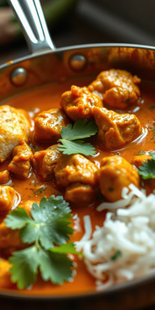 Delicious curry with chicken and white rice garnished with fresh herbs in a warm, inviting kitchen setting