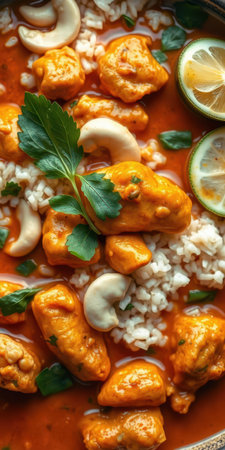 Savory chicken in rich sauce served over rice with lime and cashews garnished with fresh herbs