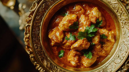 An overhead view of a delicious chicken tikka masala served in a decorative bowl, garnished with fresh herbs, showcasing vibrant colors and rich textures. Perfect for food enthusiasts.