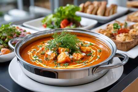Paneer tikka masala decorated with dill and cream served on a buffet table together with other Indian food, ready to be eaten
