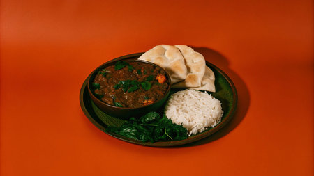 Close-up of a colorful Indian curry dish served with basmati rice, naan bread, and mango chutney