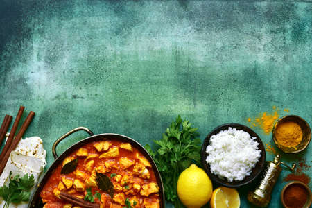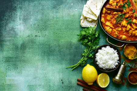 Chicken tikka masala. Traditional of indian cuisine curry and ingredients on dark background. Curry, lime, ginger, cilantro, chili, rice, herbs and spices. Top view with copy space.