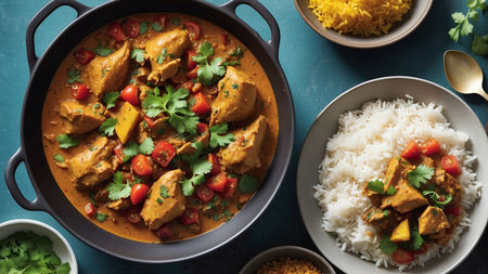 A flavorful curry dish featuring a mound of white rice and assorted spices is presented in a rustic bowl. The image showcases vibrant colors and textures, suggesting a warm and inviting atmosphere. Ideal for illustrating culinary themes, food blogs, or use in advertising materials.