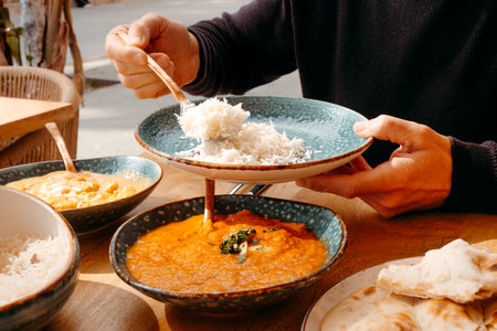 closeup of a man serving some basmati rice on a plate, sitting at an outdoors table with some different curries, such as chicken korma and chicken tikka masala