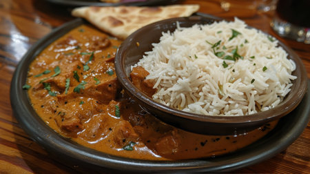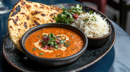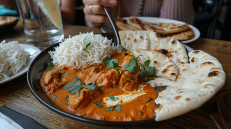 Indulge in a rich and creamy butter chicken dish served with fresh naan. This vibrant meal showcases the depth of Indian flavors and spices in every bite.