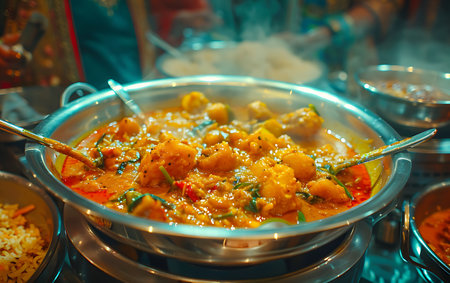 A delightful arrangement of traditional Indian vegetable curry served with rice and various side dishes on a rustic wooden table, showcasing rich flavors and culture.
