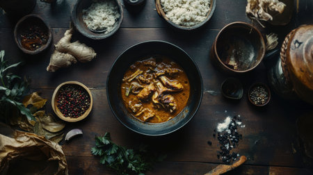 A beautifully arranged plate featuring a rich spiced dish, complemented by an array of fresh ingredients and spices, evoking a sense of culinary artistry and tradition.