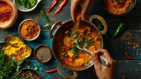 A person adding spices to a pot of curry, with vibrant colors and aromatic ingredients.