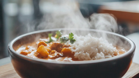 A top-down view of a steaming bowl of hot rice with a flavorful curry sauce, steam curling above the dish, emphasizing the richness and warmth of the meal.