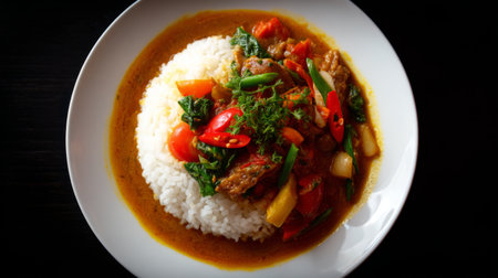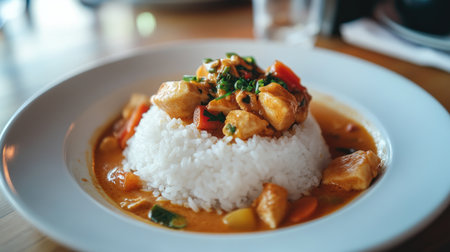 A high-resolution photo of a plate of with a delicious Thai curry poured over it, showcasing the contrast between the white rice and colorful curry.