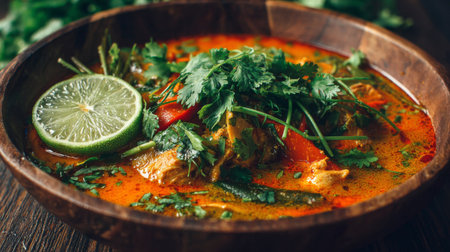 Indulge in a colorful bowl of Thai red curry, garnished with fresh herbs and lime, presenting a perfect blend of flavors and nutrition for food enthusiasts.