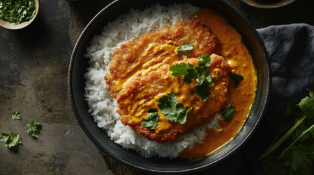 A delicious serving of crispy chicken on fluffy rice, topped with rich curry sauce and fresh herbs. Perfect for a hearty meal or takeout option.