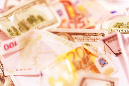 Paper bills of dollars and euros, close-up. Dollars and euros are mixed up.
