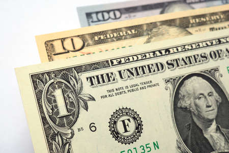 US money banknotes of 1, 10 and 100 dollars lie on a white and gray paper background close-up. American economy, investment and profit. national currency. Macro