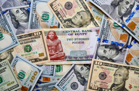 Egypt national currency on the top of USA dollar banknote backdrop. Money banknotes. Egyptian pound banknotes background. EGP and American dollar exchange rate. Top view